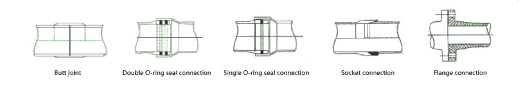 Завернутый стык, резиновое соединение, фланцевое соединение и торцевое соединение (с резиновым кольцом, уплотняющим торцевое соединение) первые три способа в основном используются для стационарного соединения между трубой и патрубком, фланцевое соединение используется для часто демонтируемых деталей, а торцевое соединение в основном используется для соединения подземных трубопроводов. трубопровод. (См. рисунок ниже).